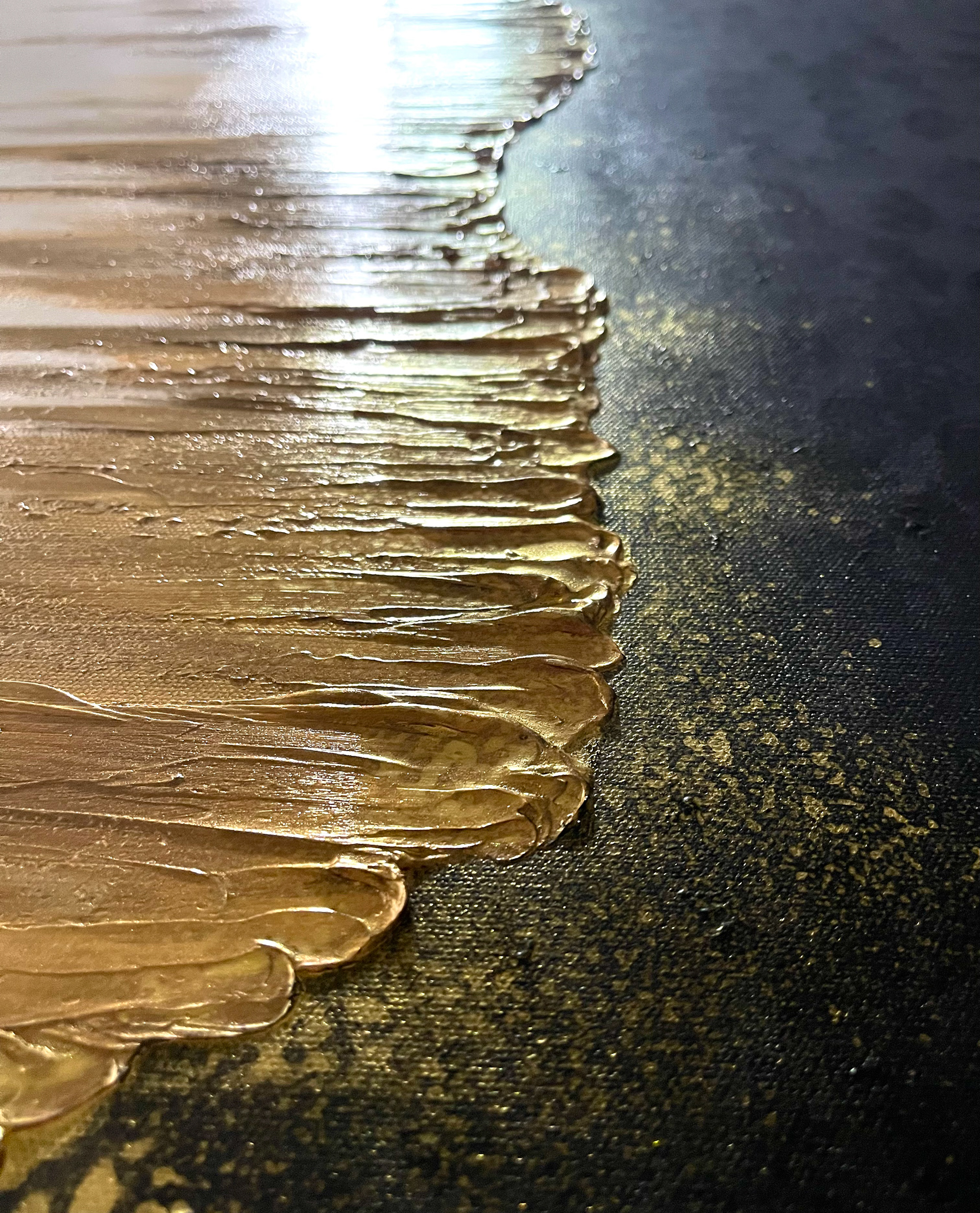 Her steps carry a calm, commanding grace; her strength, quiet yet unshakable. A wild force lives in the strokes she delivers; each with fierce precision and unerring direction. Acrylic 24 x 36 in